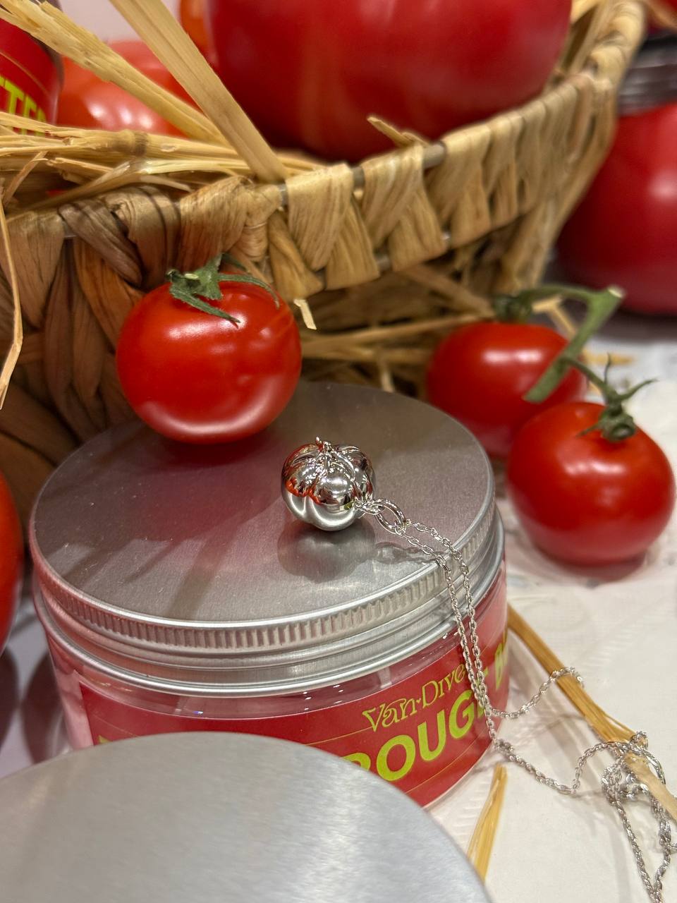 В бокс входит крем для тела с ароматом томатного листа, колье Томат, открытка.